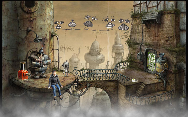 The photoshop assignment! The Assignment was to add 3 things to an existing image. I chose a place in the game Machinarium. I added my own birds, the plant curtain, the light bulb, the orange thing on the left and myself! The original image is from the game Machinarium, From Amanita Design